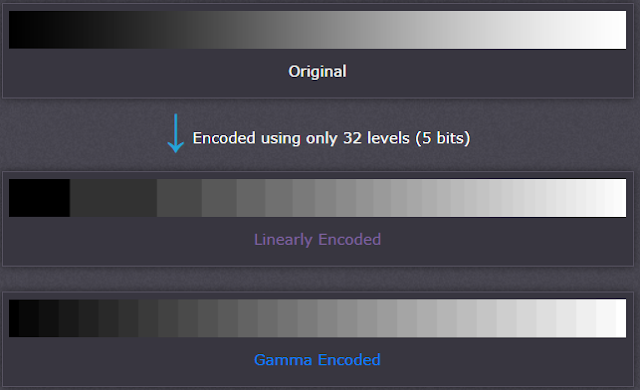 2. 감마로 인코딩된 이미지는 톤을 보다 효율적으로 저장합니다. 감마 인코딩은 우리의 눈이 인식하는 것과 가까운 색조 레벨을 재분배하기 때문에 주어진 색조 범위를 설명하는데 필요한 비트수가 줄어 듭니다. 그렇지 않으면 밝은 비트 (카메라의 민감도가 상대적으로 높은 부분)를 설명하기 위해 비트수를 초과되어 카메라가 상대적으로 덜 민감한 어두운 톤을 나타내는 비트수가 부족합니다.