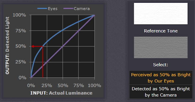 1. 우리의 눈은 카메라가 하는 것과는 다르게 빛을 인지합니다. 디지털 카메라의 경우, 광자수가 센서에서 2배가되면 신호 세기도 2배가 수신됩니다 (선형 관계). 그러나 우리의 눈은 그렇게 작동하지 않습니다. 대신, 우리는 밝기가 2배로 밝다고 생각합니다. 점점 더 높은 광도에 대해 점점 그러합니다 (비선형 관계).