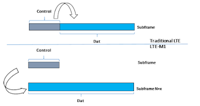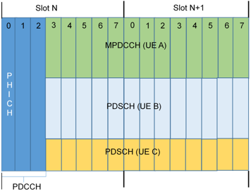 LTE-M1 UE는 한 번에 6개의 RB의 협대역만을 고려하기 때문에 전체 시스템 대역폭(PDCCH, PHICH, PCFICH)으로 전송되는 기존 LTE 채널은 eMTC에 재사용할 수 없습니다. 이것은 UE들에 제어 정보를 전송하는 또다른 메카니즘을 필요로 합니다. 또한 eNodeB는 LTE와 eMTC 장치를 동시에 지원할 것으로 예상되므로 eMTC를 위한 새로운 채널이LTE 운영을 방해해서는 안됩니다. 정규 LTE의 PDSCH 세그먼트내에서 자원 블록을 사용하는 eMTC에 MPDCCH라는 새 채널이 도입되었습니다 (그림1 참조).