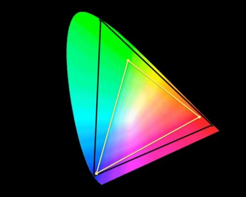 검은색 삼각형이 HDR을 나타내는데, 대략적으로 전체 사람눈으로 볼 수 있는 범위의 약75%입니다. 노란색 삼각형은 전형적인 sRGB 영상을 나타냅니다.