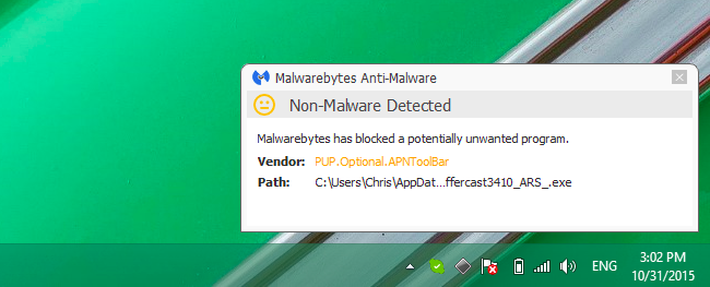 Malwarebytes와 같은 맬웨어 방지 프로그램은 잠재적으로 원치 않는 프로그램 (PUP : Potentially Unwanted Program)을 발견하면 경고를 표시합니다. 사람들은 PUP에게"Adware"및 "Crapware"를 비롯한 많은 다른 이름을 사용합니다. 이러한 프로그램을 컴퓨터에 설치하는 것을 원하지는 않지만 법적인 이유로 다른 범주로 분류됩니다.