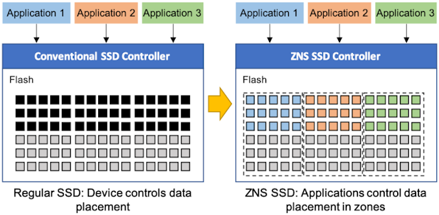 NVMe ZNS SSD는 SMR 하드 디스크와 유사하게 각 구역에는 순차적으로 저장하고 명시적으로 리셋하면서, NVMe Namespace에서는 구역으로 읽으면서 이러한 이점을 얻습니다.