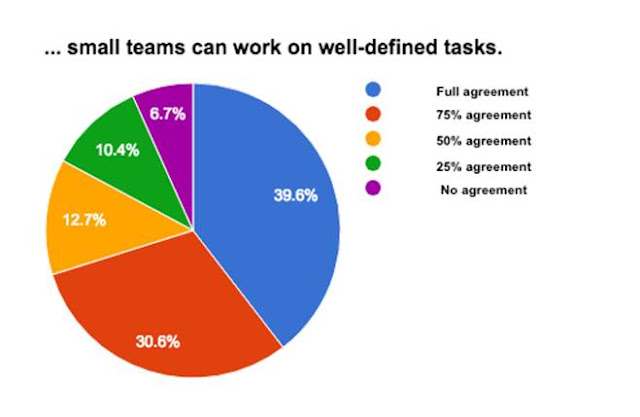 마이크로 서비스는 팀 구조에 긍정적인 영향을 미칠 수 있으며 응답자는 이에 동의하는 것으로 보입니다. 참가자중 39.6%는 소규모팀이 잘 정의된 작업을 할 수 있다는 사실에 강력히 동의합니다.
