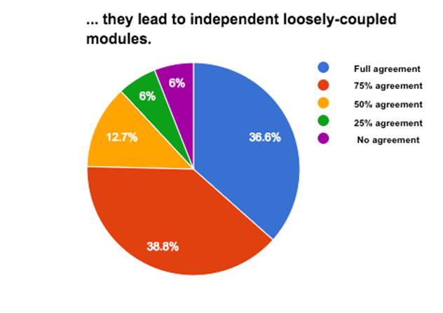 마이크로서비스가 느슨하게 결합된 독립적인 모듈로 이어질 수 있다고 응답자의 38.8%가 긍정적인 응답을 했으며 36.6%는 완전히 동의했습니다.