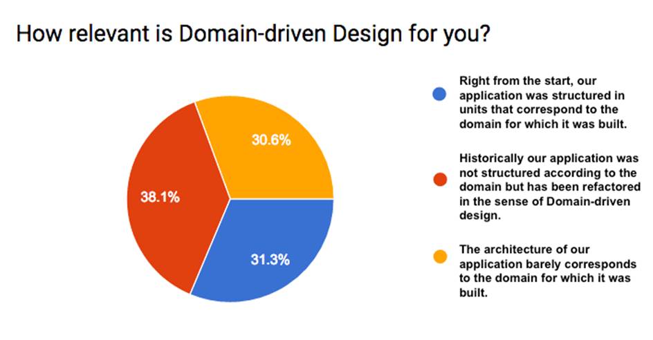 도메인 기반 설계가 마이크로서비스와 밀접한데, 설문 조사에 따르면 도메인 주도 디자인은 사용자와의 관련성이 여전히 높은 것으로 나타났습니다.