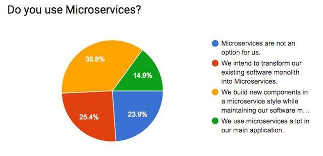 마이크로서비스에 대한 응답자의 23.9% 정도는 마이크로서비스가 선택 사항이 아니라고 응답했습니다. 한편 응답자의 35.8%는 이중 전략을 추구하고 있습니다. 기존의 모놀리식 응용프로그램은 계속 실행되지만 마이크로서비스 아키텍처 스타일로 구축된 새로운 구성 요소로 보완됩니다.