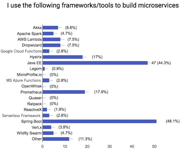설문 조사 결과, Spring Boot가 조사 응답자의 거의 50%의 선호도를 가지고 있으며, 그다음으로 자바 EE를 선호합니다 (44.3%).